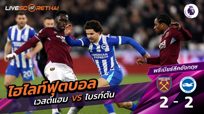 ดูฟรี ไฮไลท์ฟุตบอล พรีเมียร์ลีกอังกฤษ เวสต์แฮม VS ไบรท์ตัน ที่ livescorethai4.tv